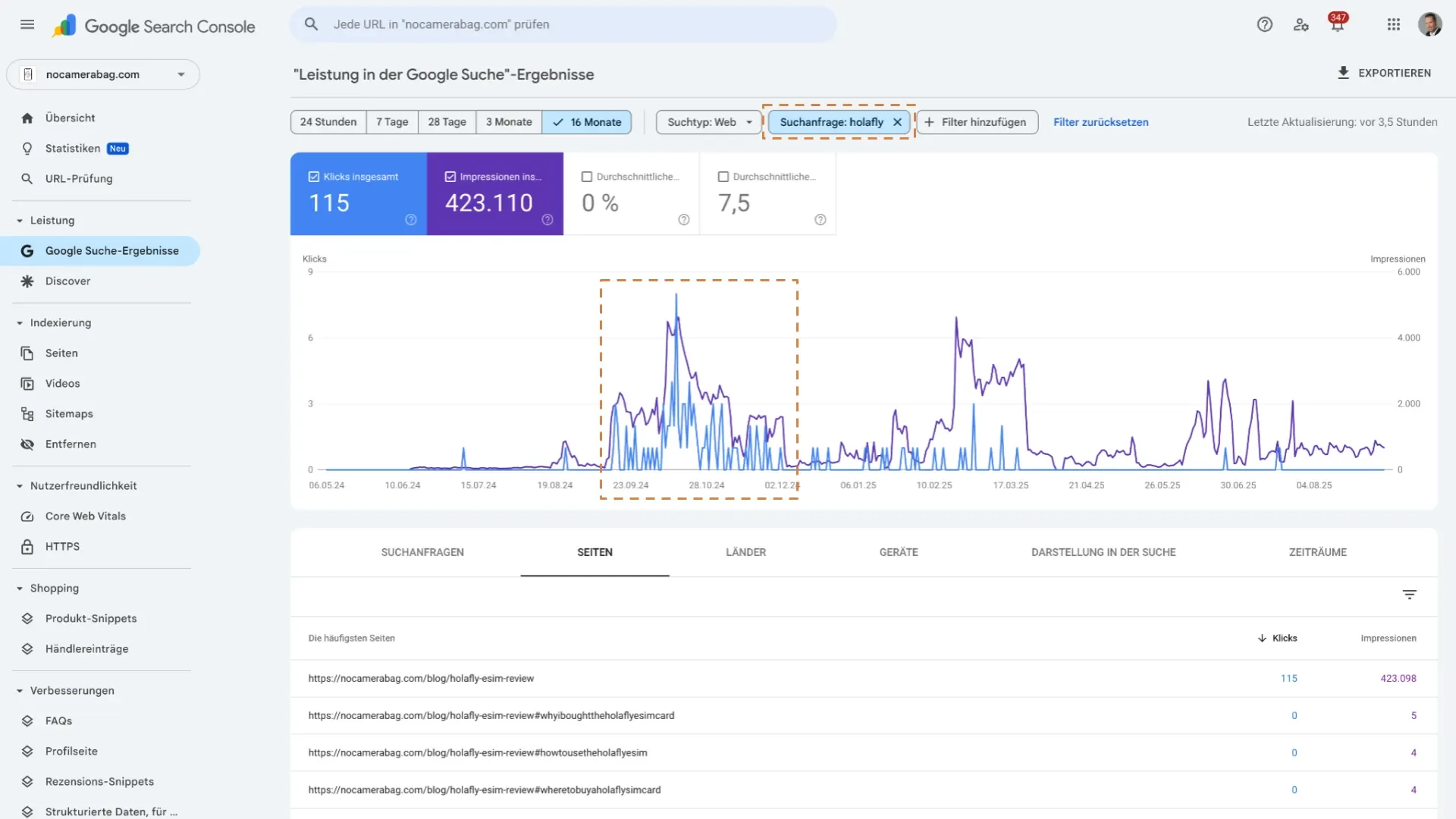 Du siehst hier den Verlauf der Impressionen und Klicks für die Suchanfrage "Holafly". Das ist ein eSIM-Anbieter, über den ich einen Review geschrieben habe.
