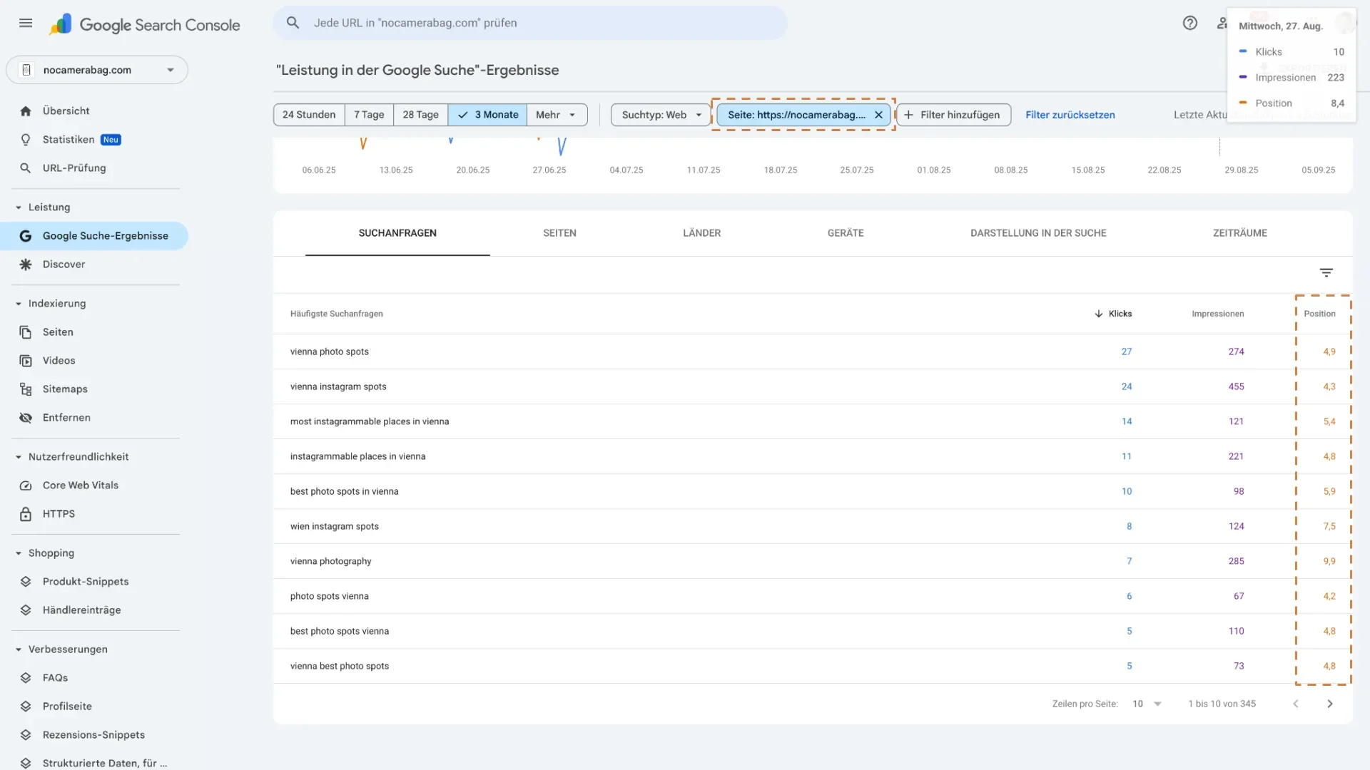 Für "photo spots vienna" und diverse Variationen rankt mein Blog-Post unter den Top 10 irgendwo zwischen Position 4 und 9. Das entspricht also eher dem nicht personalisierten Suchergebnis.