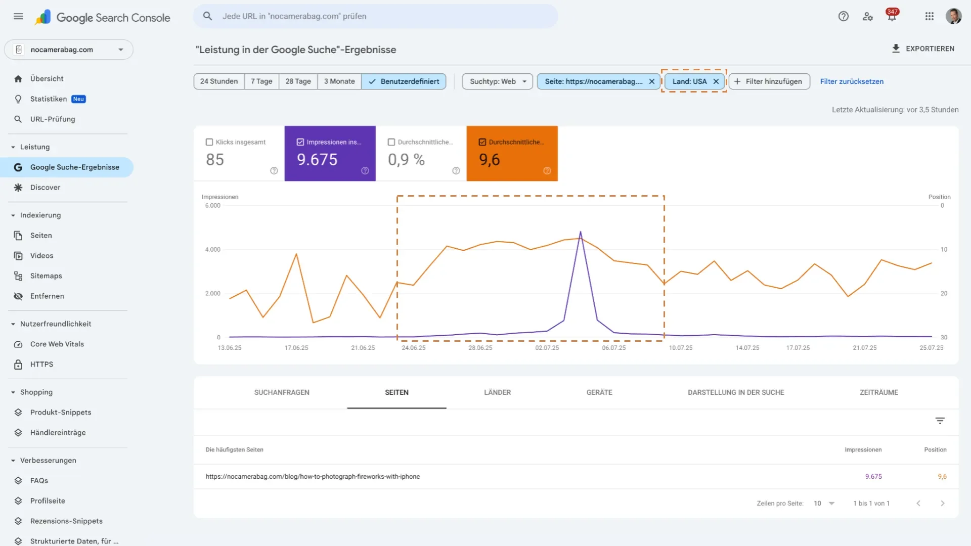 Auf welcher Position eine deiner Seiten tatsächlich für eine bestimmte Suchanfrage im Durchschnitt rankt, siehst du in der Google Search Console: