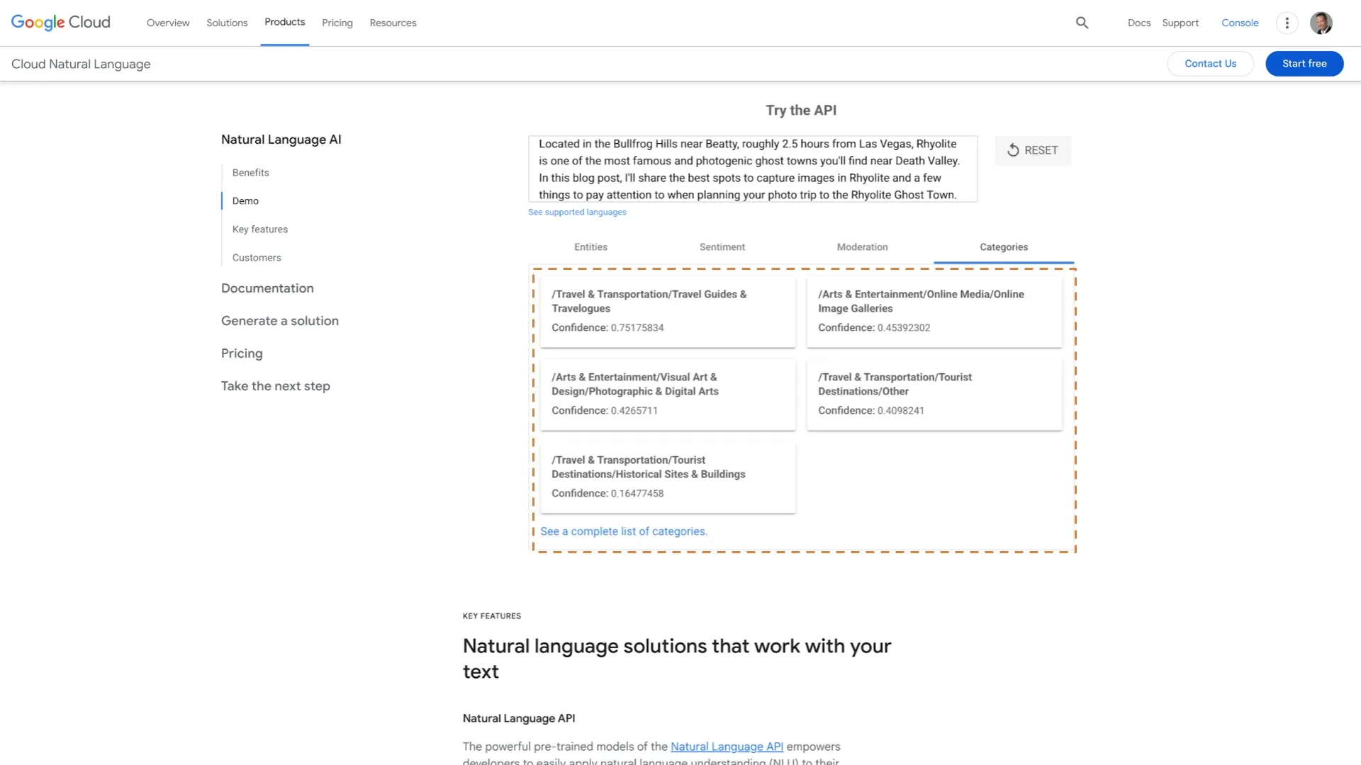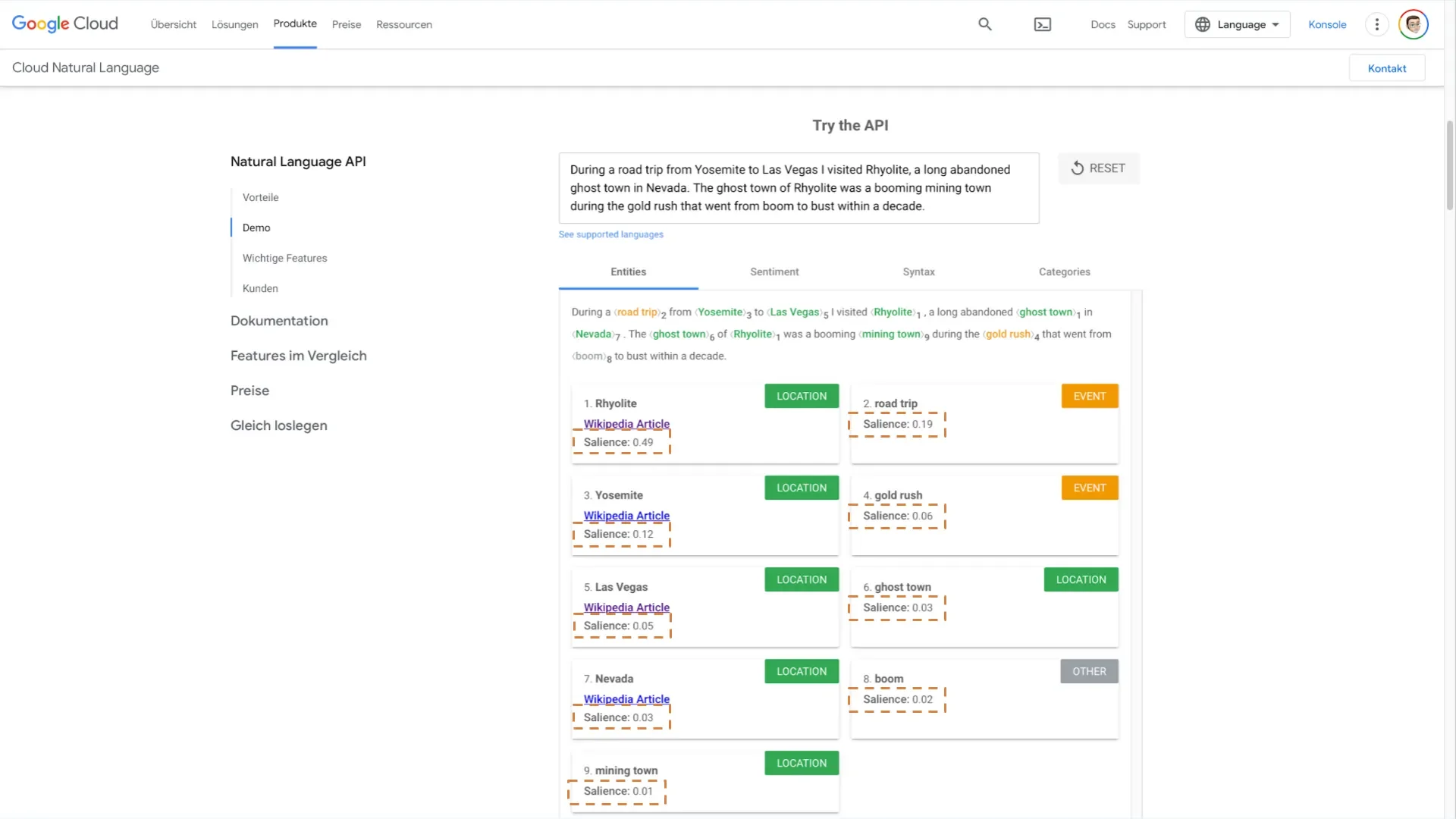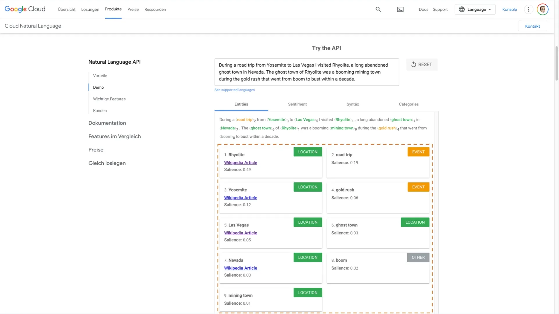 Bei meinem Text über die Geisterstadt Rhyolite siehst du, dass er in die passenden Kategorien fällt, etwa "Travel Guides" und "Tourist Destination". Wobei die Confidence für "Travel Guides" am höchsten ist.