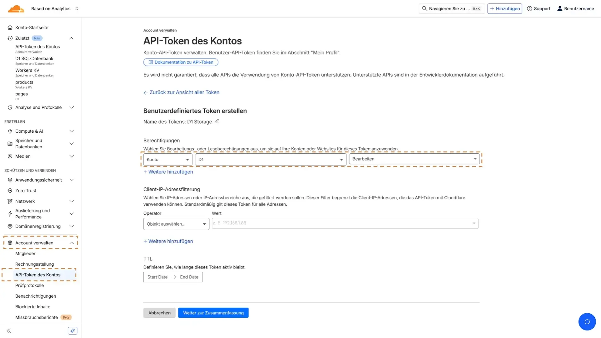 Einen API-Token erstellst du in deinem Account. Klicke dazu in der Seitenleiste unter "Account verwalten" auf "API-Tokens des Kontos" und lege einen neuen API-Token an. Wichtig ist dabei, unter "Berechtigungen" die Einstellung "Konto" auszuwählen und bei den Berechtigungen die Option "D1 Storage" mit den Berechtigungen "Bearbeiten.