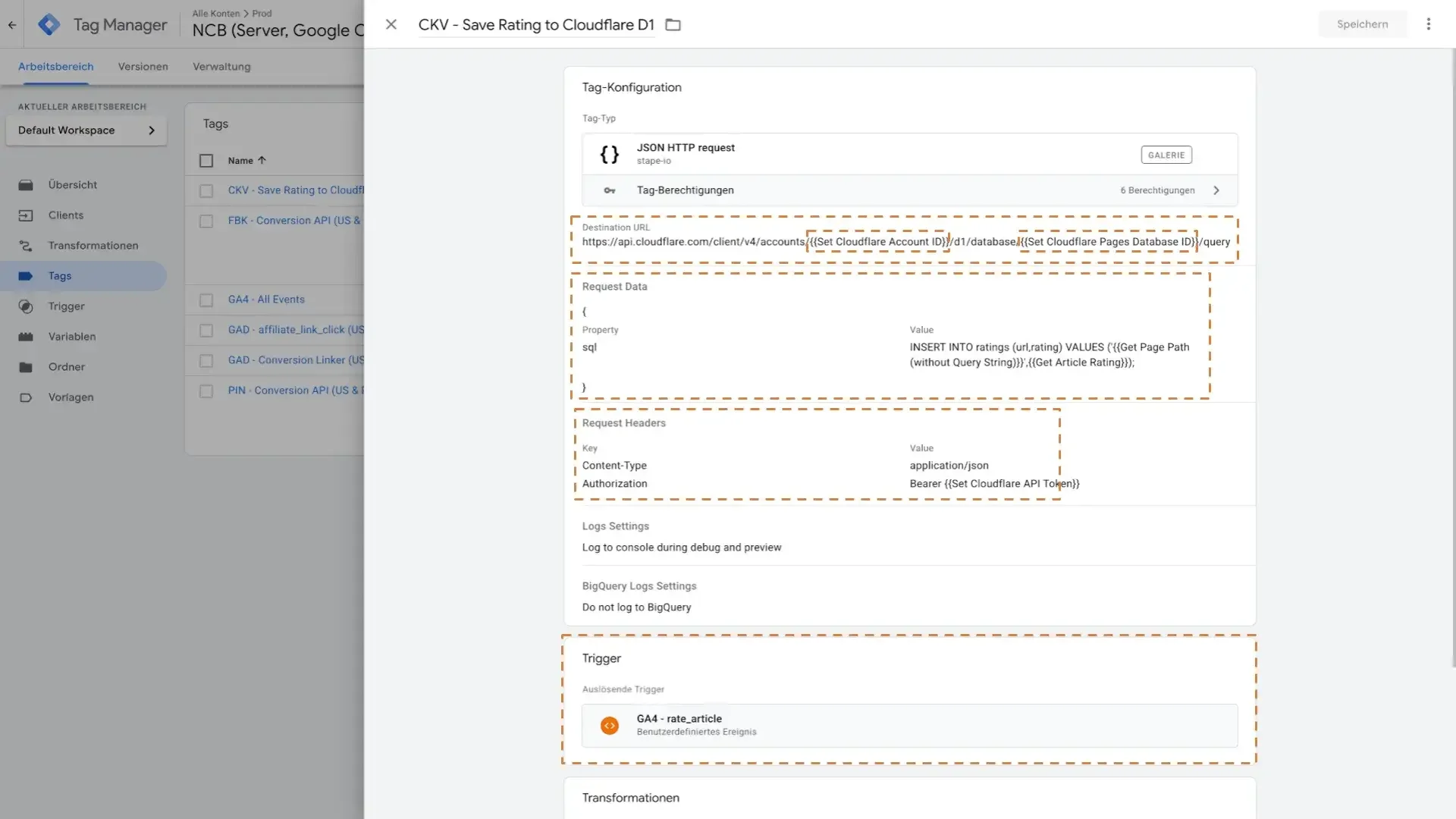 Die API-URL muss die Cloudflare Account-ID und die Datenbank-ID enthalten. Dafür haben wir uns weiter oben die entsprechenden Variablen im serverseitigen Tag Manager angelegt. Ich habe sie im obigen Screenshot speziell hervorgehoben.
