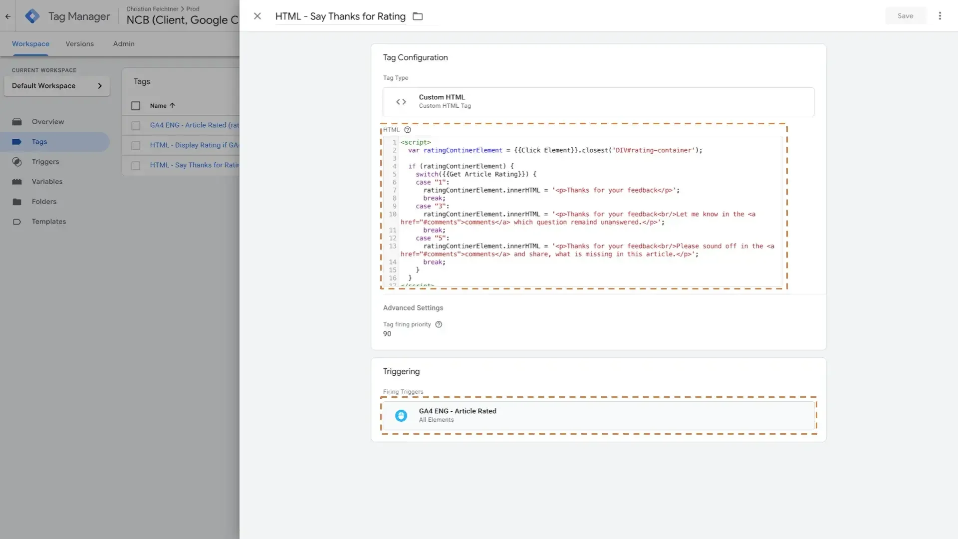 Mit dem Klick-Trigger feuere ich nicht nur das GA4-Ereignis Tag im clientseitigen Tag Manager für das Ereignis "rate_article", sondern auch benutzerdefiniertes HTML Tag. Dieses Tag blendet das HTML-Snippet mit den Smileys für die Bewertung nach einem Klick daraus aus und stattdessen eine "Danke-Meldung" ein.