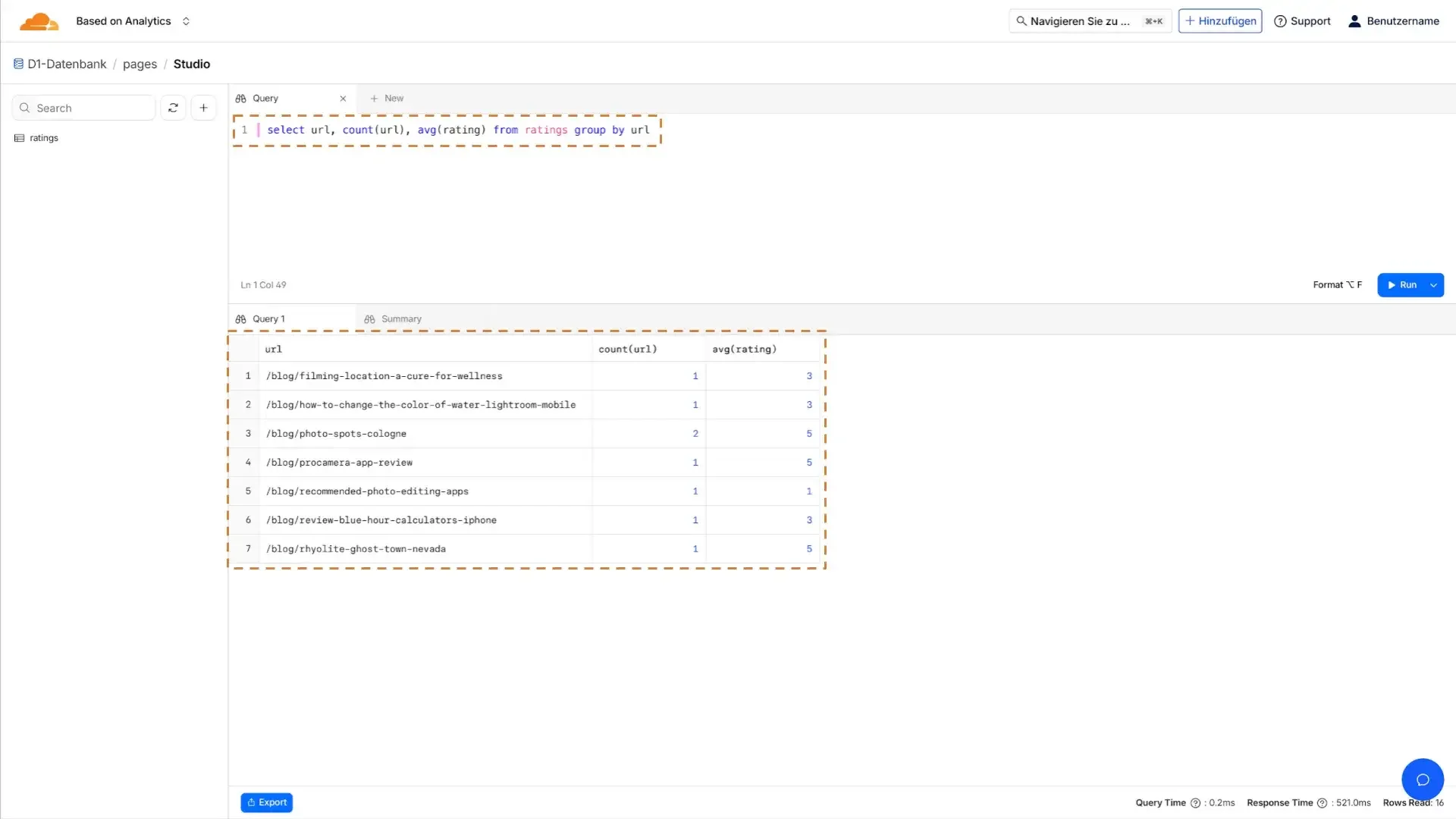 Als Ausgangsbasis für dieses Beispiel habe ich in Cloudflare eine D1 Datenbank mit der Tabelle "ratings" angelegt. Die Tabelle enthält nur 2 Felder, nämlich "url" und "rating". Das Feld "url" enthält die URL (bzw. den Pfad der Seite), für die eine Bewertung abgegeben wurde, und das Feld "rating" enthält einen Wert zwischen 1 (schlechteste Bewertung) und 5 (beste Bewertung).