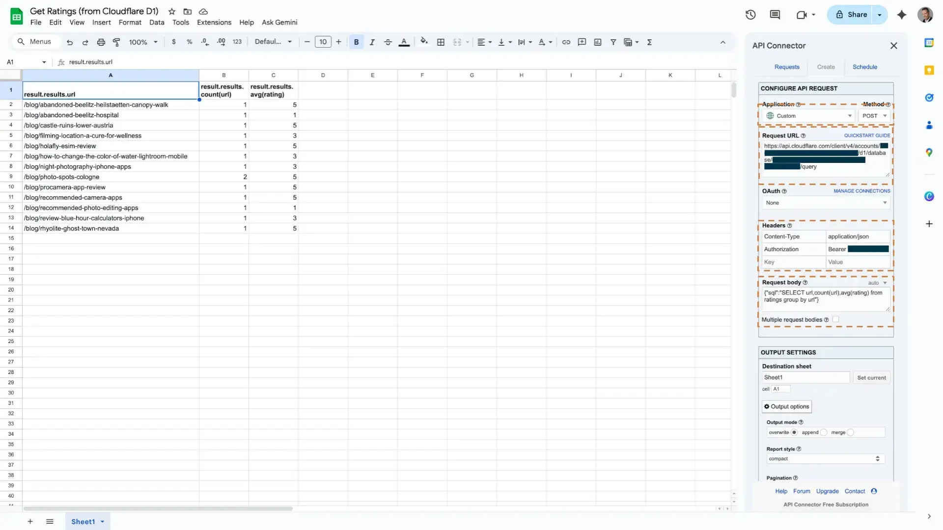 Daten der Cloudflare D1 Storage via “API Connector” in Google Sheets anzeigen
