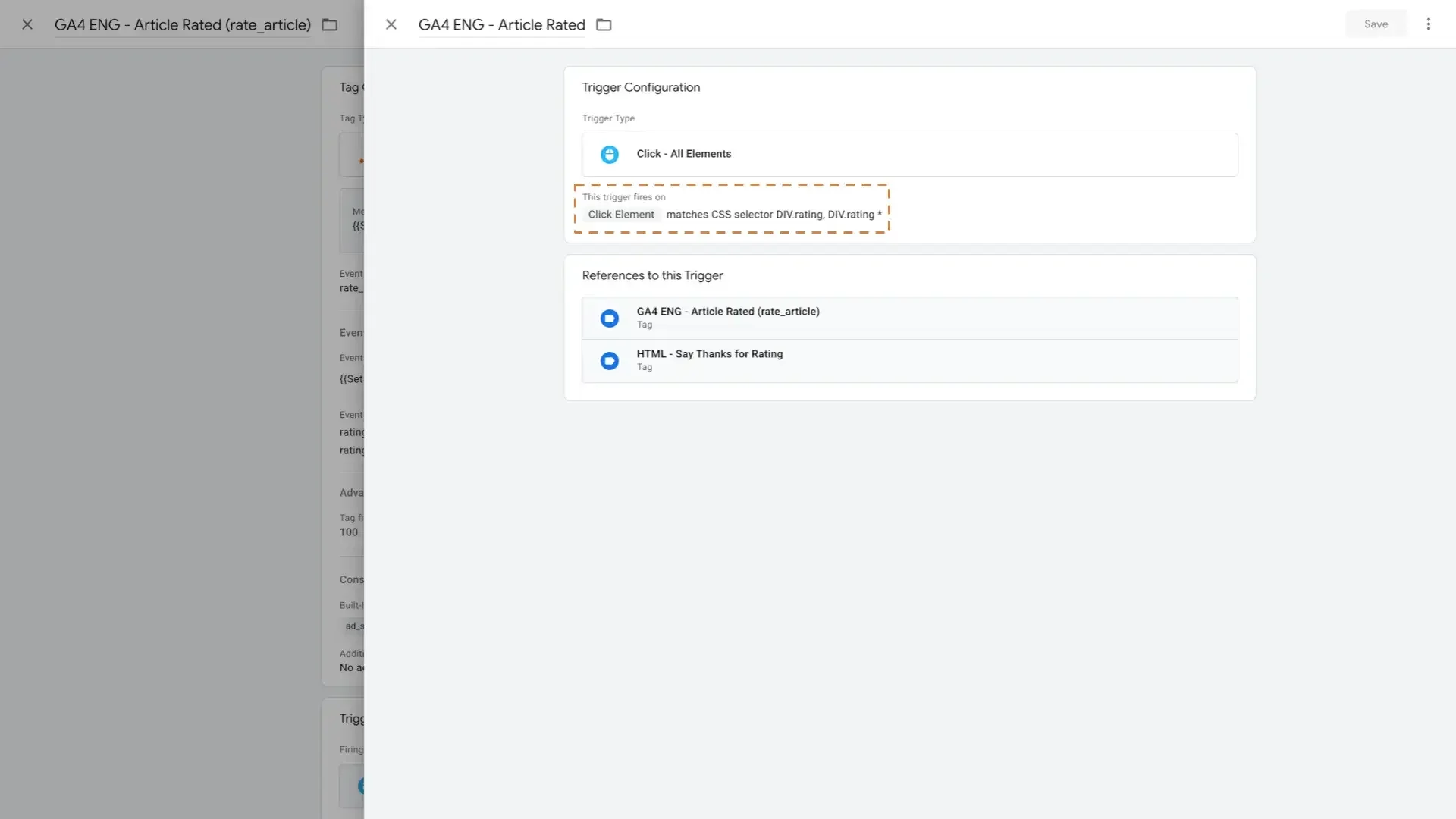 DIV.rating, DIV.rating *Würde ich in der Triggerbedingung nur den CSS-Selektor "DIV.rating" angeben, würde der Klick-Trigger nur dann reagieren, wenn jemand in den weißen Bereich des DIV-Tags rund um den Smiley klickt, aber nicht, wenn jemand direkt auf den Smiley oder den Text klicken würde. Deshalb gibt es den zweiten CSS-Selektor "DIV.rating *". Damit reagiert der Klick Trigger bei einem Klick auf jedes Element innerhalb des DIVs mit der CSS-Klasse "rating".