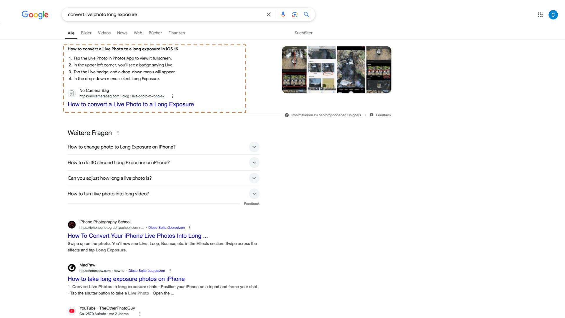- Wird bei den ersten Suchergebnissen eine Schritt-für-Schritt-Anleitung als Featured Snippet oder Rich Result angezeigt, ist das ein Hinweis auf den User Intent “Transaktional” und “Do” (etwas machen oder lernen).