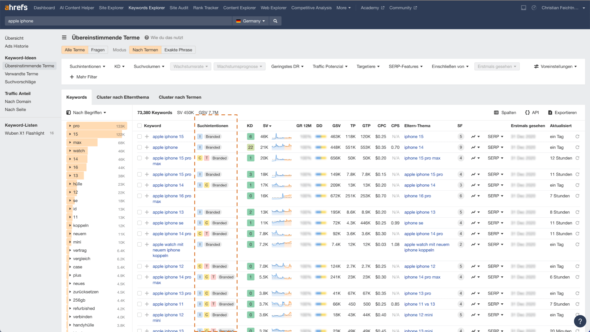 Auch verschiedene SEO Tools zeigen dir mittlerweile eine vermutete Suchintention an, wie du am Beispiel von ahrefs im Screenshot siehst.