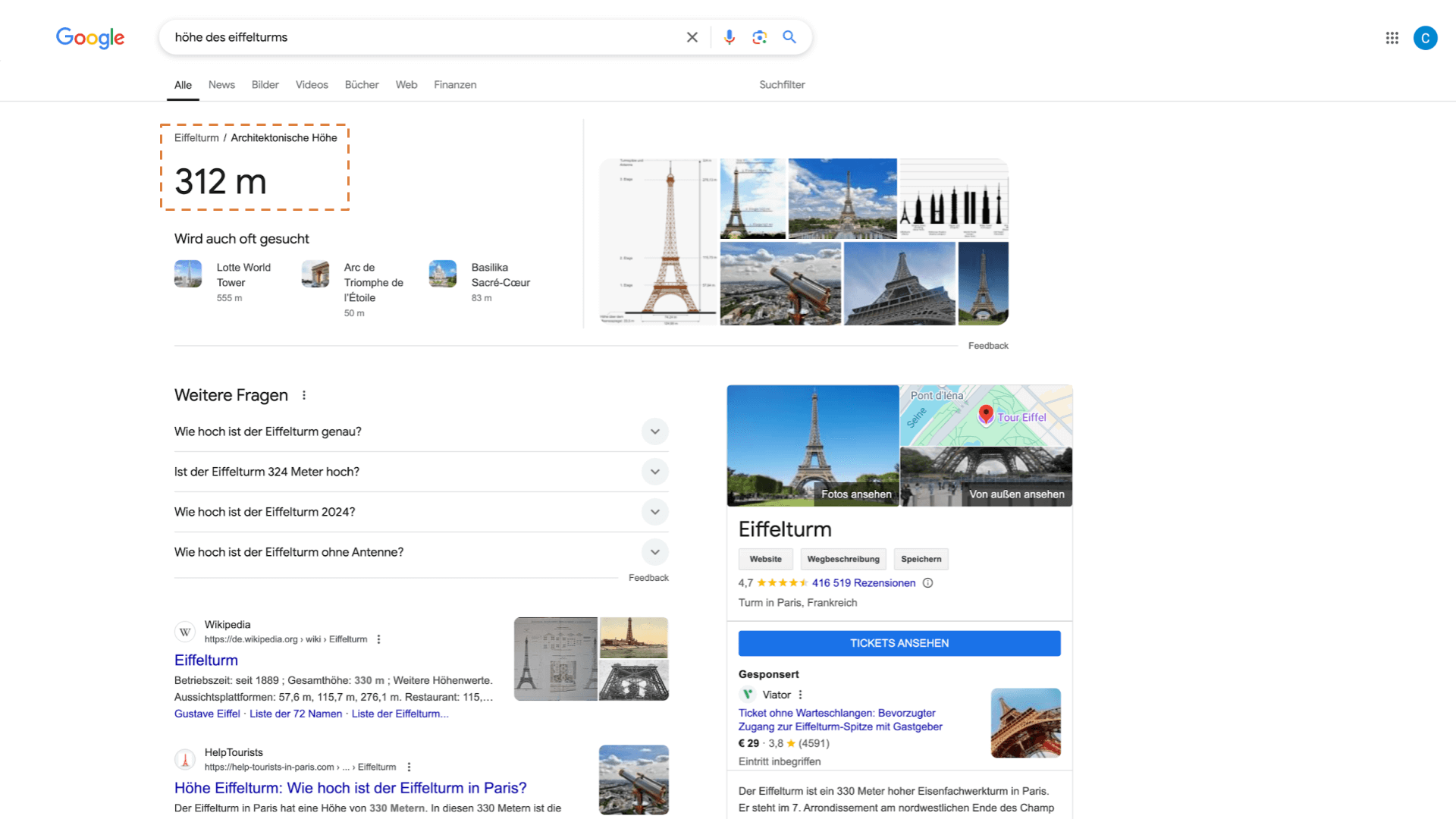 Bei diesem User-Intent kennt Google einen Untertyp mit der Bezeichnung “Know-Simple”. Eine Suchanfrage mit diesem User-Intent lässt sich in der Regel sehr kurz beantworten. Ein Beispiel dafür ist die Suchanfrage nach “Höhe des Eiffelturms”. Eine solche Suchanfrage beantwortet Google in der Regel direkt in den Suchergebnissen.